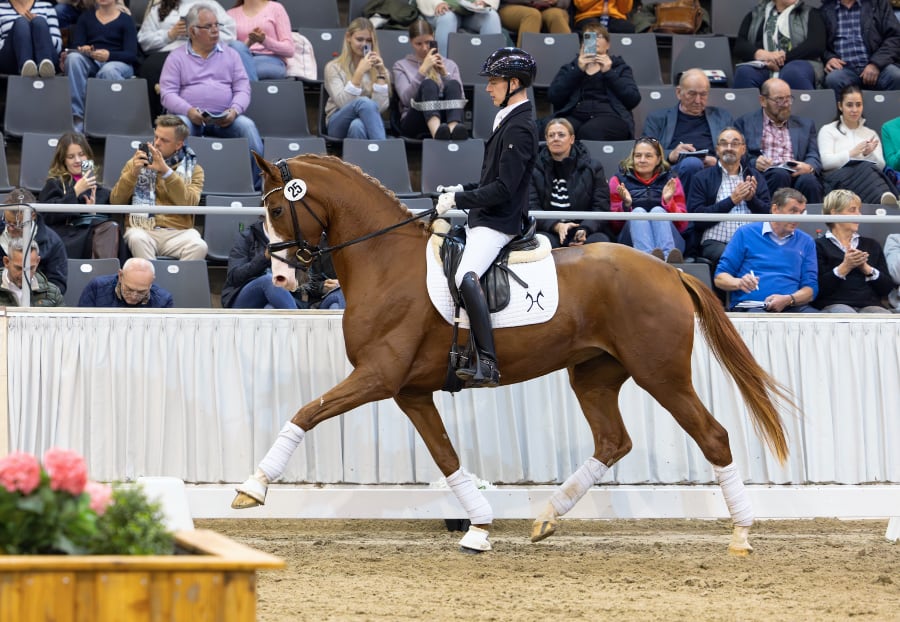 Schon bei ihrer Zuchtstutenprüfung hatte die Secret/Royal Blend-Tochter Vet+ Sunshine (Z. u. Ausst.: Anneli Brunckhorst, Wohlesbostel) mit der Traumnote 10 für die Rittigkeit überzeugt. Dies wussten auch die Verdener Kunden zu schätzen und machten die ausdrucksstarke und mit dem gewissen Etwas ausgestattete Fuchsstute mit dem Verkaufspreis von 150.000 Euro zur Preisspitze der Jubiläumsauktion. Ein Dressurausbilder aus Frankreich sicherte sich die vierjährige Zukunftshoffnung.