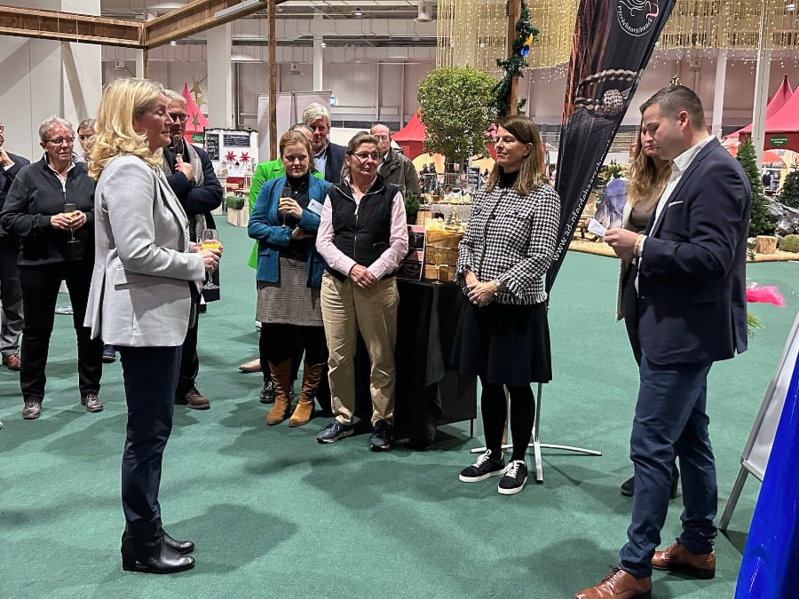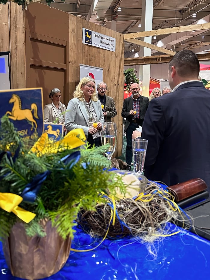 Eine ganz besondere Ehrung gab es am 5. Dezember 2024 auf der Messe Passion Pferd am Stand der Pferdeland Niedersachsen GmbH: Die Präsidentin des Pferdesportverbands Hannover, Alexandra Duesmann, bekam von ihren Stellvertretern Jan Schalk und Maike Bielfeldt die Goldene Ehrennadel des Niedersächsischen Reiterverbandes überreicht.