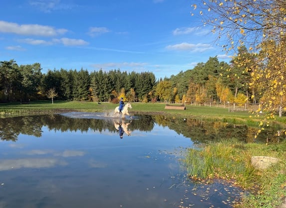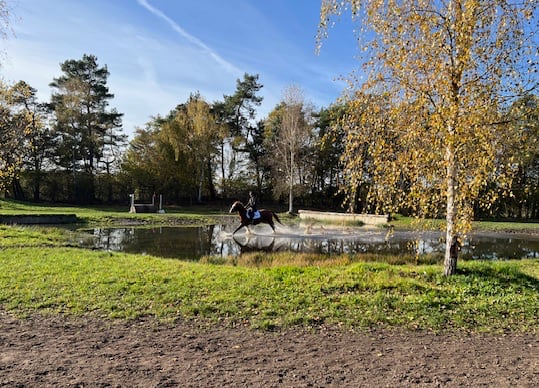Erstmals fanden die Teilprüfungen Springen und Gelände auf dem etwas versteckt liegenden kleinen Geländeplatz statt, was sich als ein großer Gewinn für die Teilnehmer und Zuschauer sowie Trainer herausstellte. Der Platz und der Hindernisaufbau waren sehr einladend, so dass es viele sehr gute Bilder gab und viele Reiter mit ihren Ponys und Pferden den Parcours hervorragend absolvierten. In der Mitte des Platzes lag der große Teich, der zweimal im Galopp durchritten werden musste. Die Reiter bekamen von Landestrainer vorab alle die Möglichkeit, ihren Ponys und Pferden das Wasser zu zeigen und im Schritt zu durchreiten, so dass es dort gar keine Probleme gab. Die ehemalige Geschäftsführerin des PSV Hannover, Erika Putensen, war ebenfalls vor Ort und erfreute sich an den schönen Ritten.